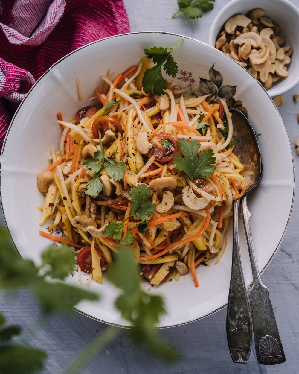 - Sekoita kasvikset, pähkinät ja korianteri keskenään kulhossa ja kaada sekaan kastike. Sekoita ja siirrä hetkeksi jääkaappiin maustumaan. Salaatti on säilyy jääkaapissa hyvänä pari päivää.