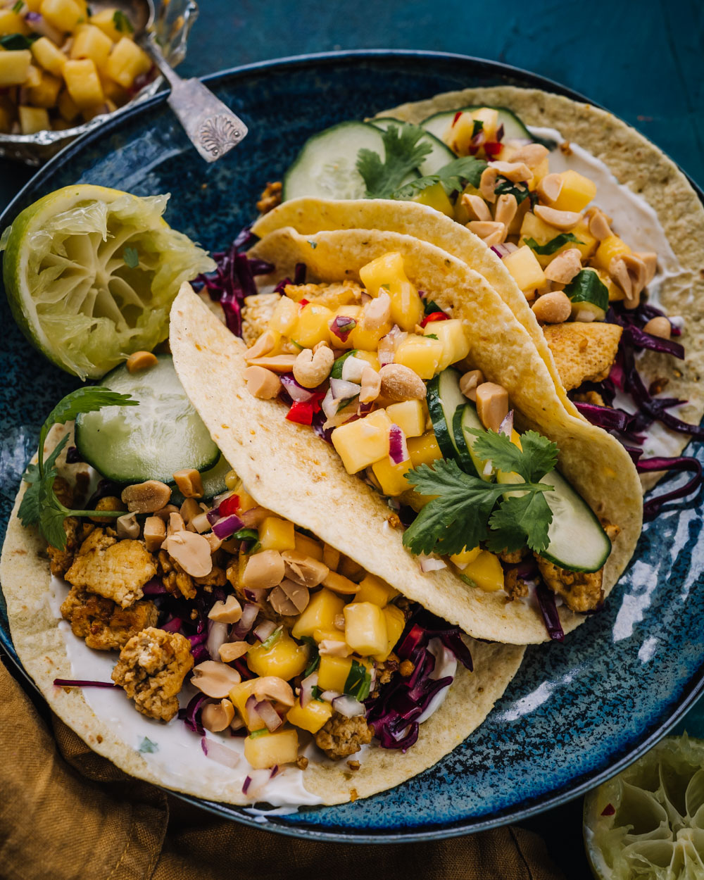 - Täytä tortillat lime-korianterikastikkeella, limemarinoidulla punakaalilla, tofulla, kurkkusiivuilla ja mangosalsalla. Viimeistele rouhituilla suolapähkinöillä.