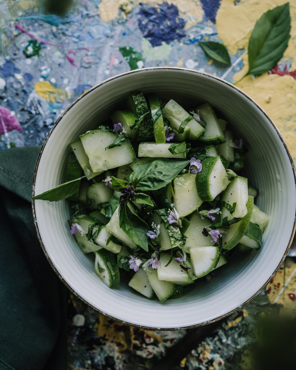 - Leikkaa kurkku pitkittäin neljään osaan ja sitten siivuiksi. Hienonna basilika.