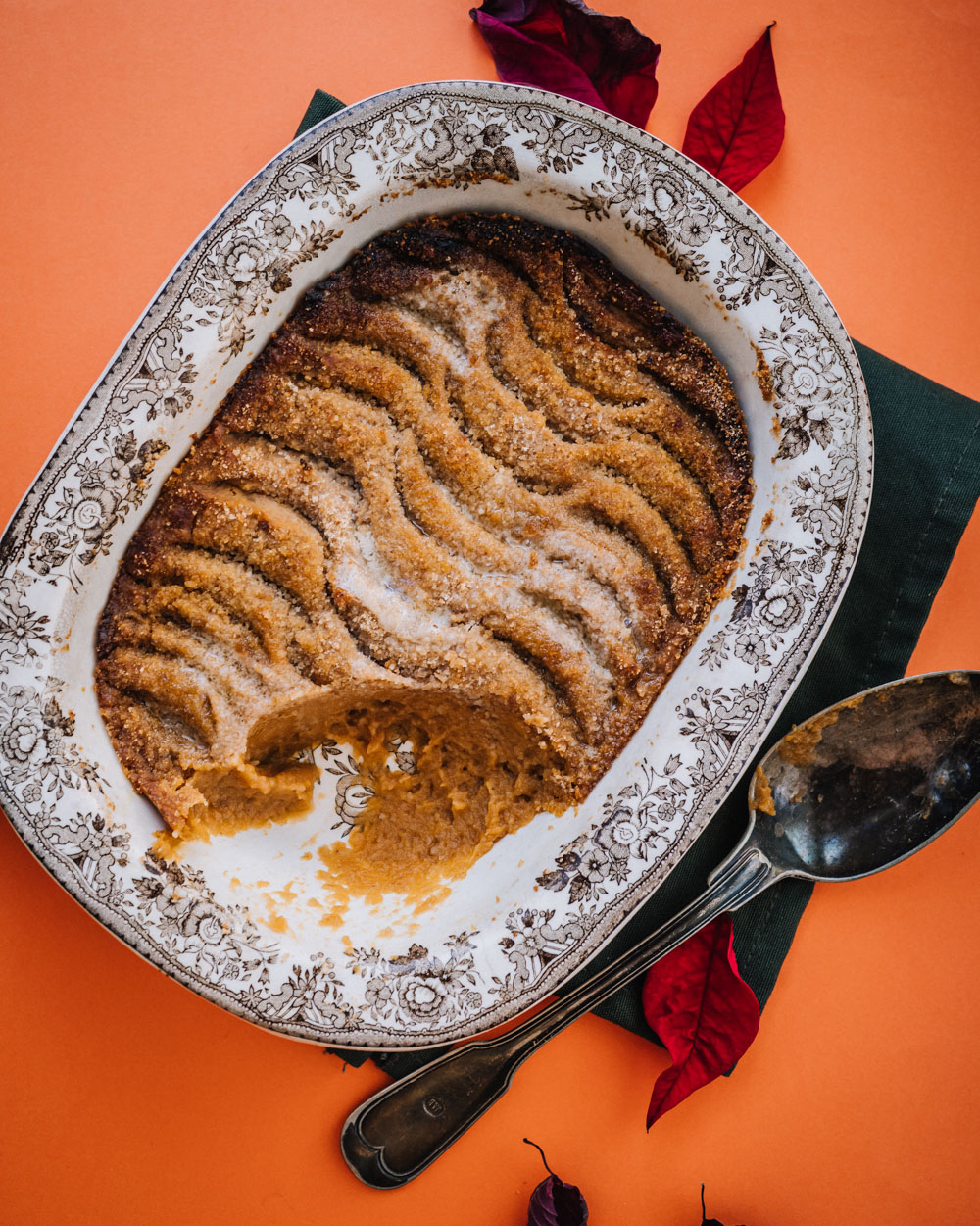 - Voitele vuoka ja levitä bataattiseos vuokaan. Ripottele pinnalle korppujauhot ja tee pintaan halutessasi koristekuvioita. Levitä voi nokareina vuoan pinnalle.