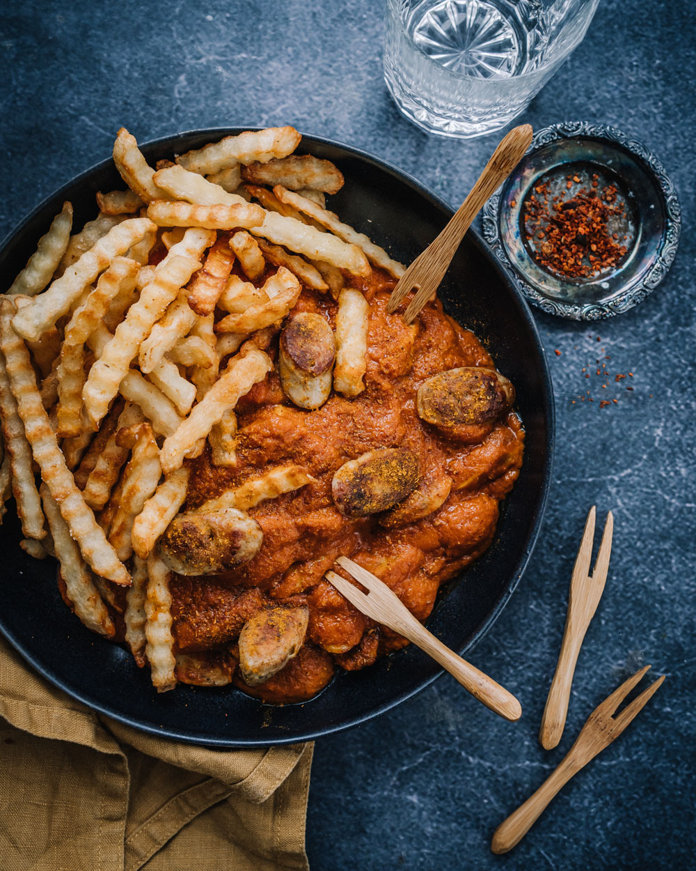 Currywurst on berliiniläinen klassikkoruoka: makkaraa currylla maustetun tomaattikastikkeen kera. Tällä reseptillä valmistat alkuperäisen veroisen currywurst-annoksen – täysin kasvipohjaisesti!