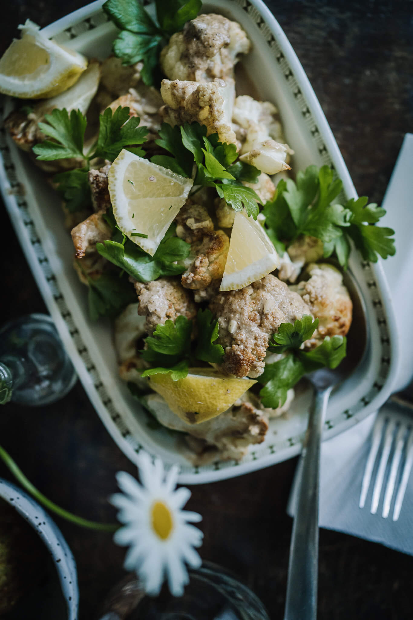 Kun kukkakaalin uppopaistaa, saa se ihanan maun ja mukavan rakenteen. Yleensä kukkakaalit tupataan friteerata taikinaan dipattuna, mutta nämä kaunokaiset pulahtavat kuumaan öljyyn ihan sellaisinaan. Kun kuumien kukkakaalien päälle kaataa tahinikastikkeen, imevät kukkikset maut ihanasti sisäänsä. Päälle vielä liraus sitruunamehua, nam!