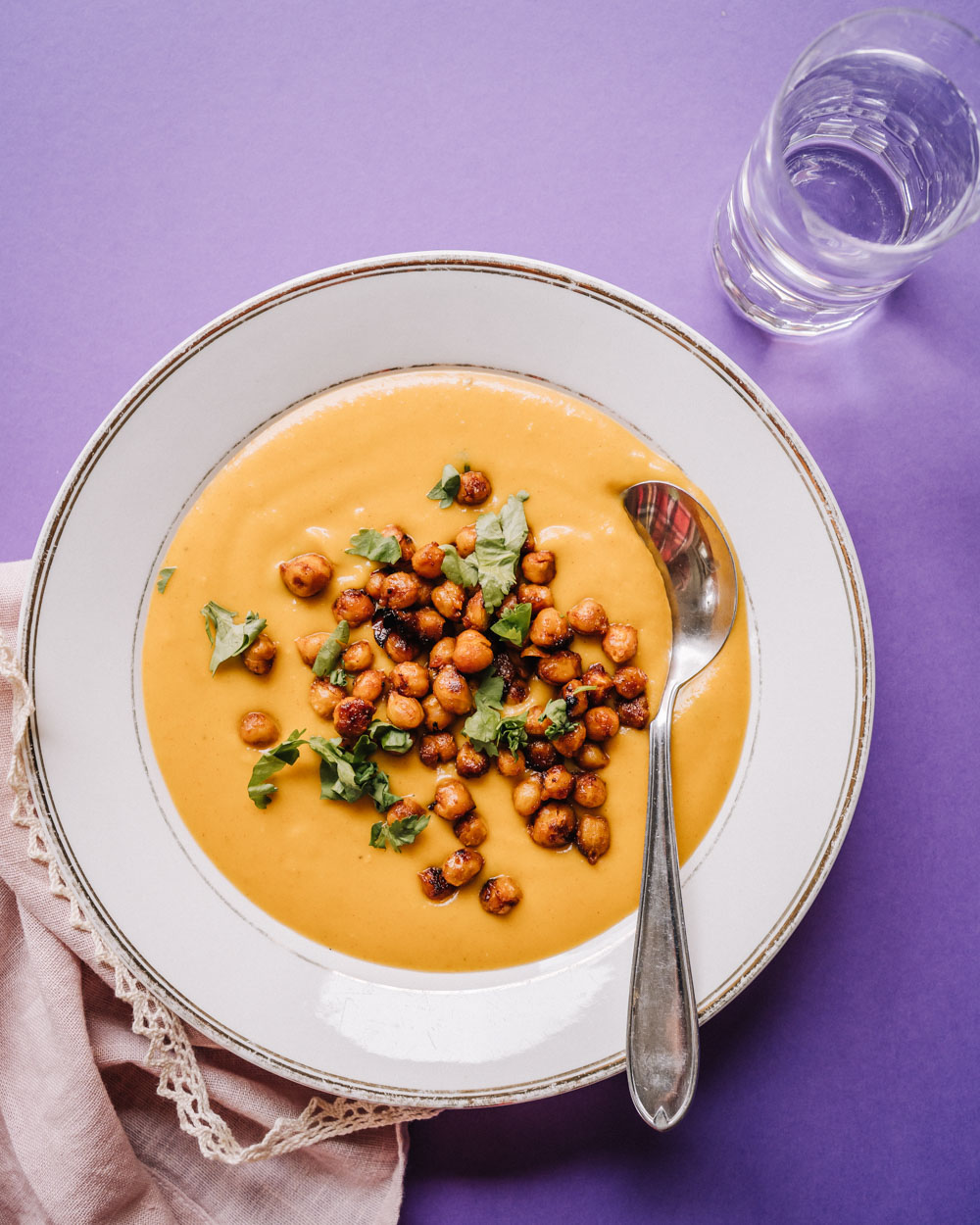 - Lisää kookosmaito kattilaan ja soseuta soppa. Mausta suolalla ja mustapippurilla. Tarjoile gochujang-kikherneiden kanssa.