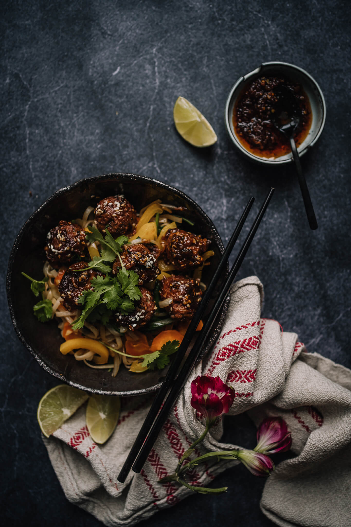Tarjoile hoisin-glaseeratut vegepyörykät esimerkiksi paistettujen nuudelien kanssa. Mukaan voi pilkkoa runsaasti kasviksia: sipulia, porkkanaa, herkkusieniä ja eri värisiä paprikoita. Kata pöytään lisäksi chilitahnaa ja limelohkoja.