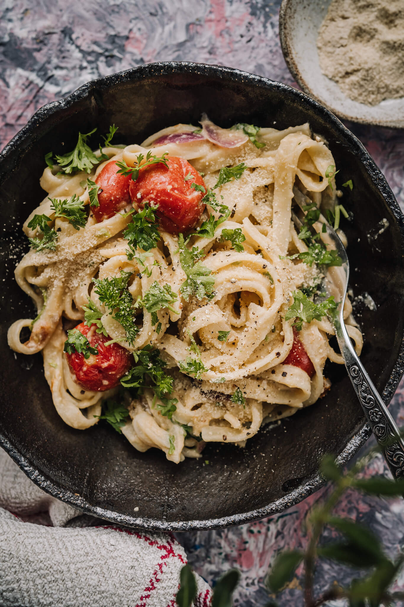 Hummuspastassa maistuu valkosipuli, aurinkokuivatut tomaatit ja lopuksi joukkoon sekoitettu persilja (tai basilika). Pannulla kypsyneet kokonaiset kirsikkatomaatit antavat hauskaa rakennetta ja hapokkuutta, ravintohiivahiutaleet umamisuutta. Tämä pasta jää takuulla repertuaariisi!