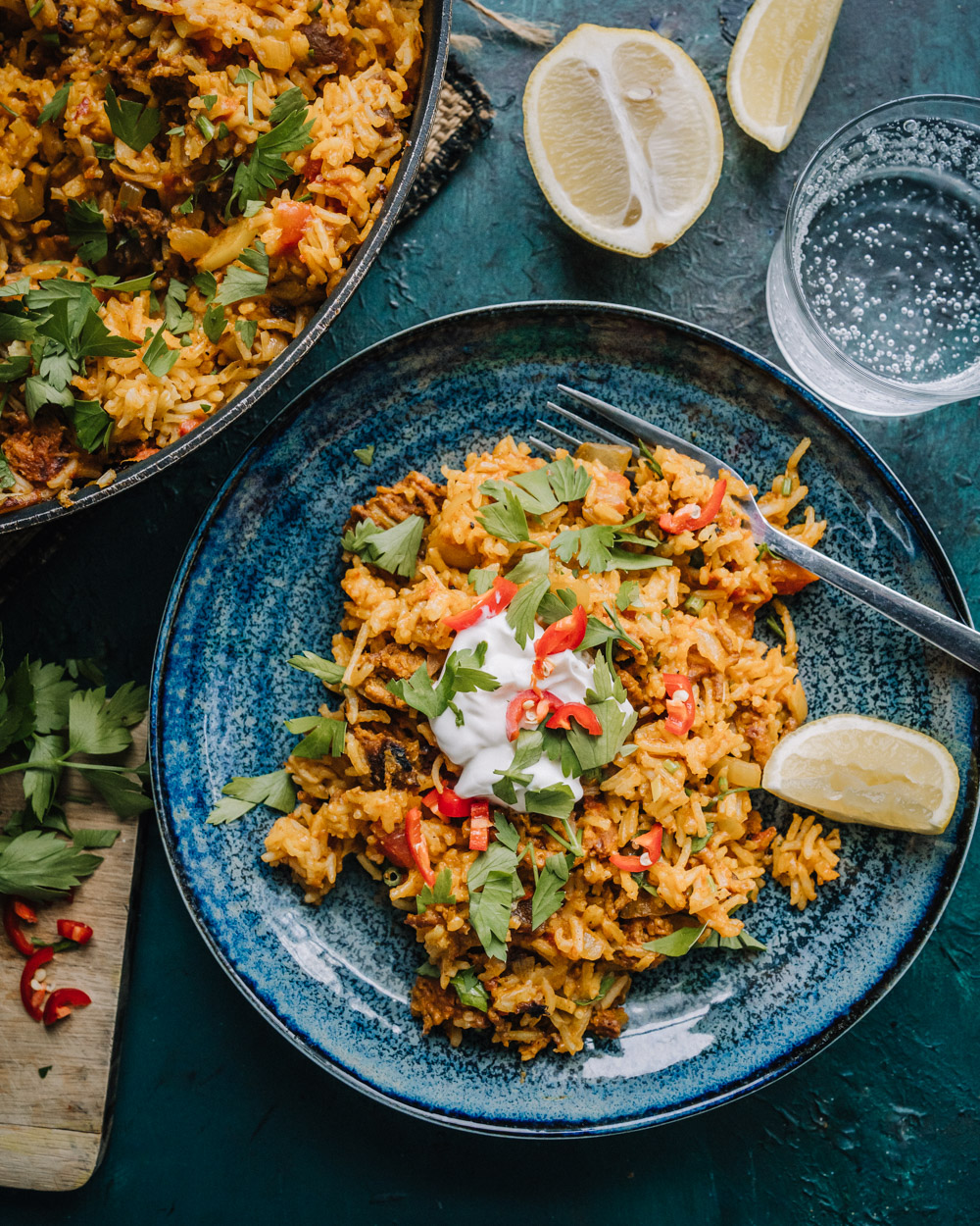 - tarjoiluun tuoretta chiliä, sitruunalohkoja, lehtipersiljaa tai korianteria sekä kasvipohjaista jogurttia tai fraichea