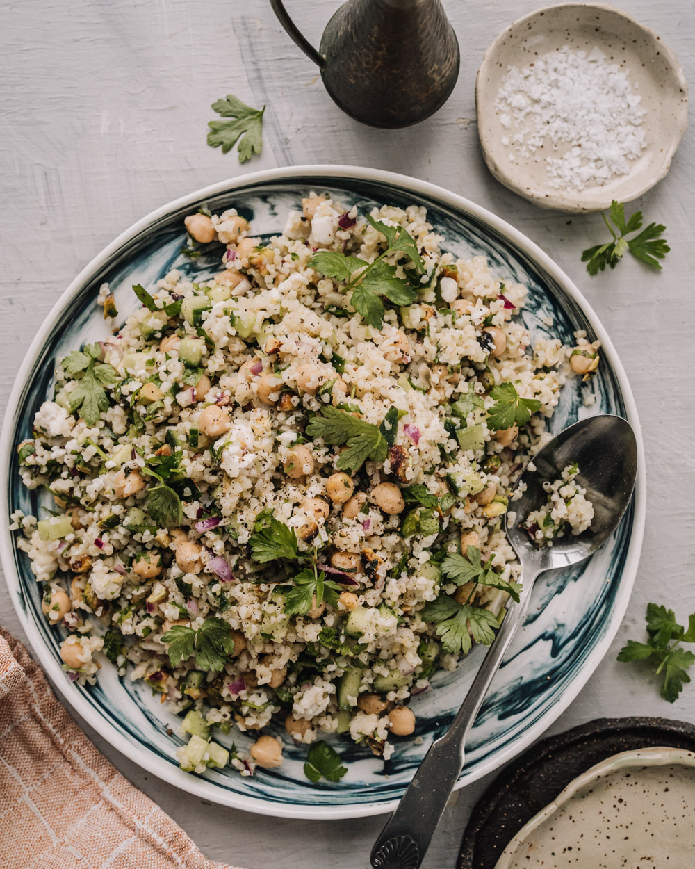Jennifer Anistonin salaatti on somehitiksi noussut maukas ruoka, jossa maistuvat bulgur, kikherneet, pistaasipähkinät ja tuoreet yrtit. Vegaaninen versio onnistuu helposti vaihtamalla feta kasvipohjaiseen.