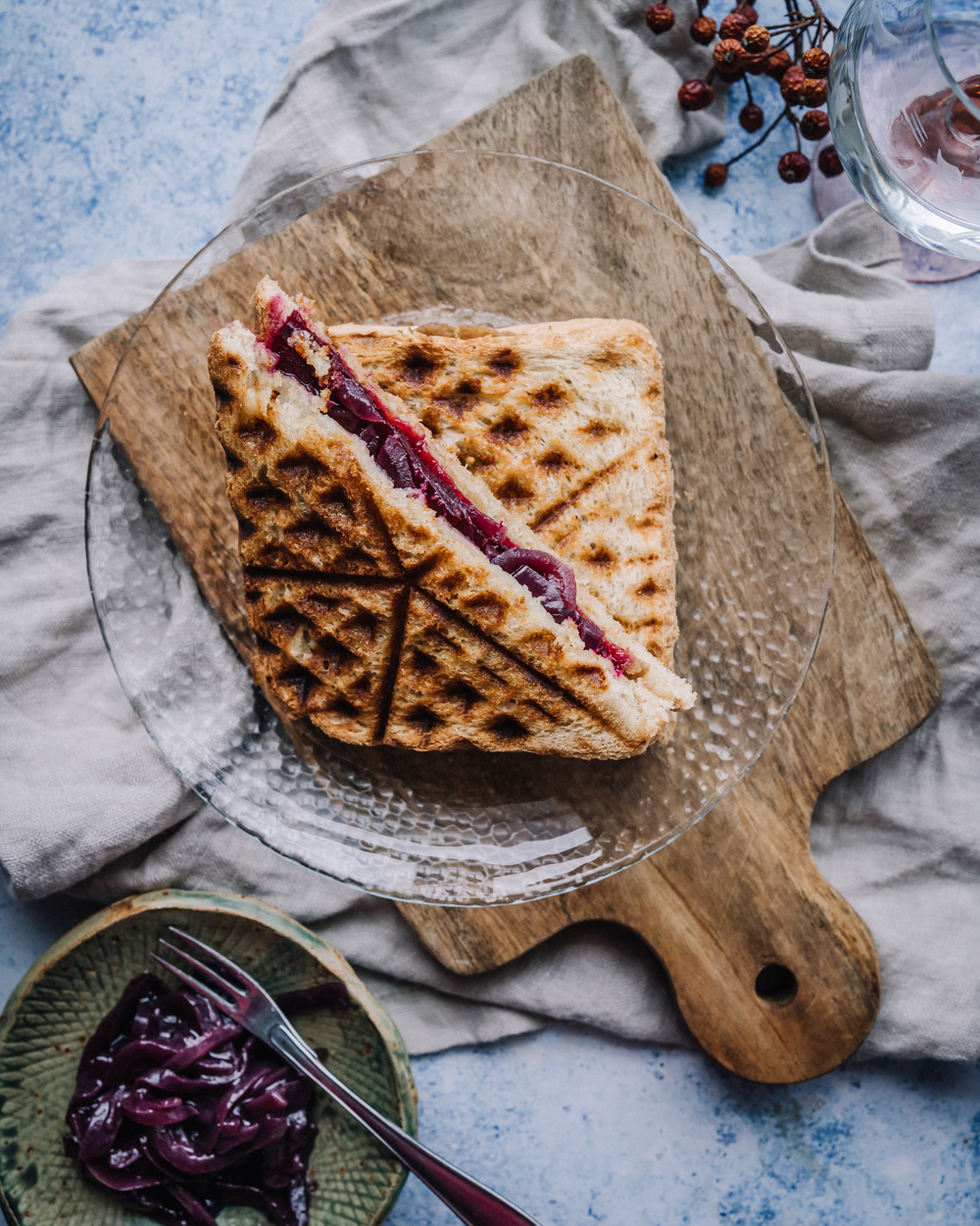 Jouluisiin hävikkitoasteihin saa näppärästi käytettyä jouluruokien tähteitä. Esimerkiksi seitankinkku punasipulihillokkeen ja punajuuren kanssa ovat mitä mainioimmat toastin täytteet.