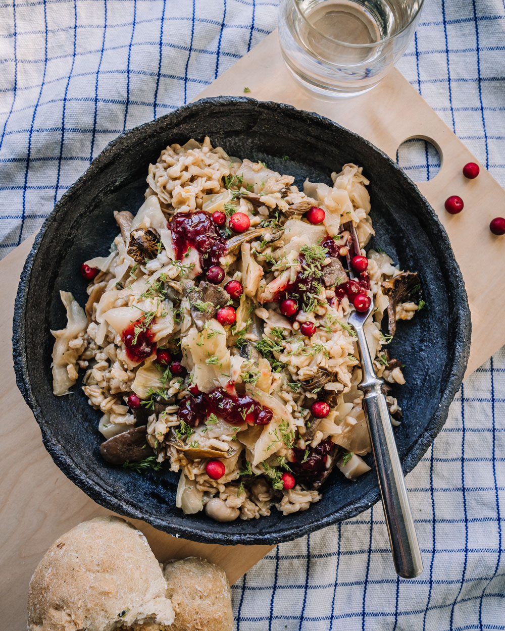 Kaali-sienipannu kauralla on mainio syksyinen ruoka, johon sopivat hyvin vähemmän käytetyt, mutta runsain mitoin metsistä löytyvät rouskut ja haperot. Kaalipannu tarjoillaan tietysti puolukoiden kera!