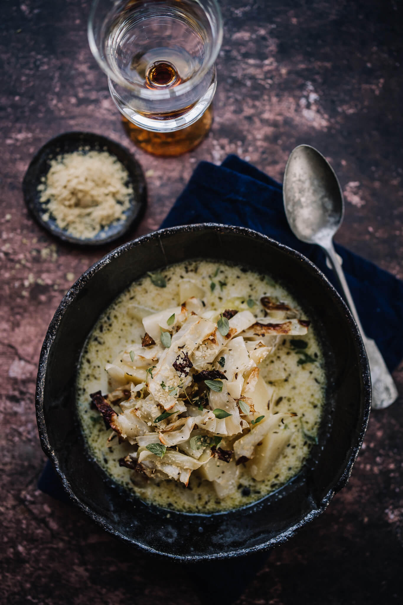 Erikseen paahdettu kaali antaa keitolle luonnetta. Sen voi sekoittaa sopan joukkoon ennen tarjoilua tai jakaa annosten päälle vähän fiinimmän lopputuloksen aikaansaamiseksi.