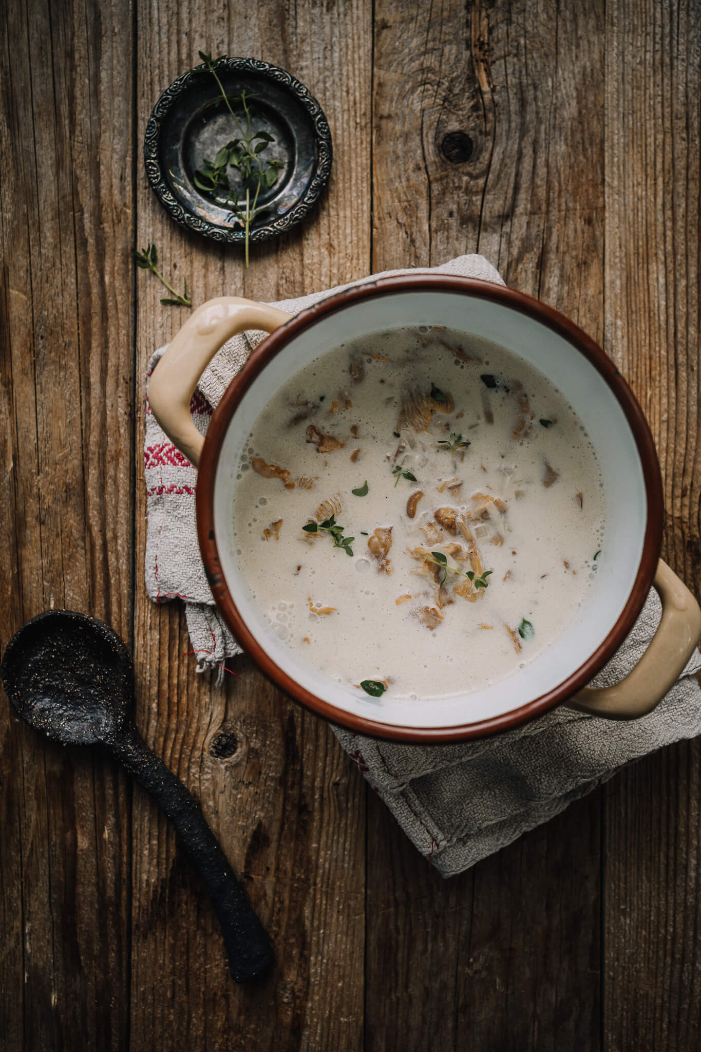 - Lisää kerma ja anna kiehua hiljakseen noin viiden minuutin ajan. Mausta tuoreella hienonnetulla timjamilla, suolalla ja valkopippurilla.