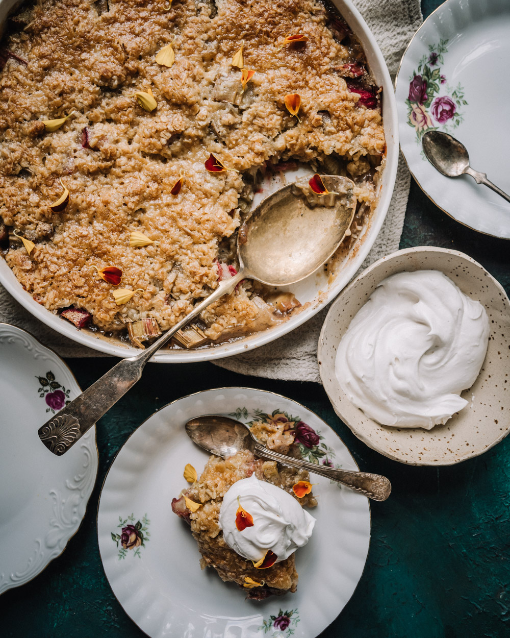 Kuvassa kardemumma-raparperipaistos on koristeltu syötävillä kukan terälehdillä.