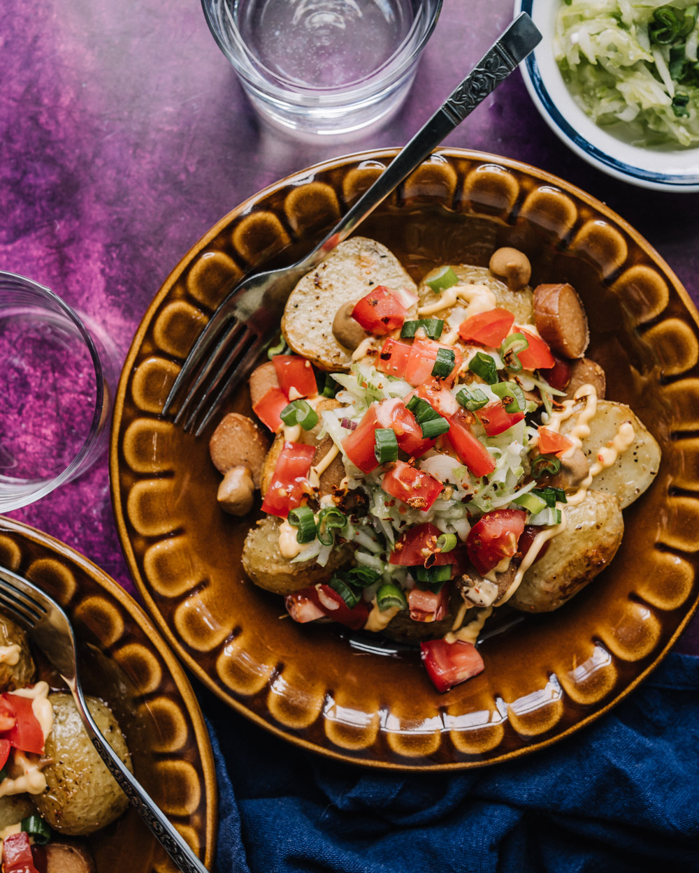 Kesäiset makkaraperunat valmistetaan varhaisperunoista ja vegemakkarasta. Raikkaan twistin se saa tuorekurkkurelissistä, jossa maistuu valkosipuli ja inkivääri.