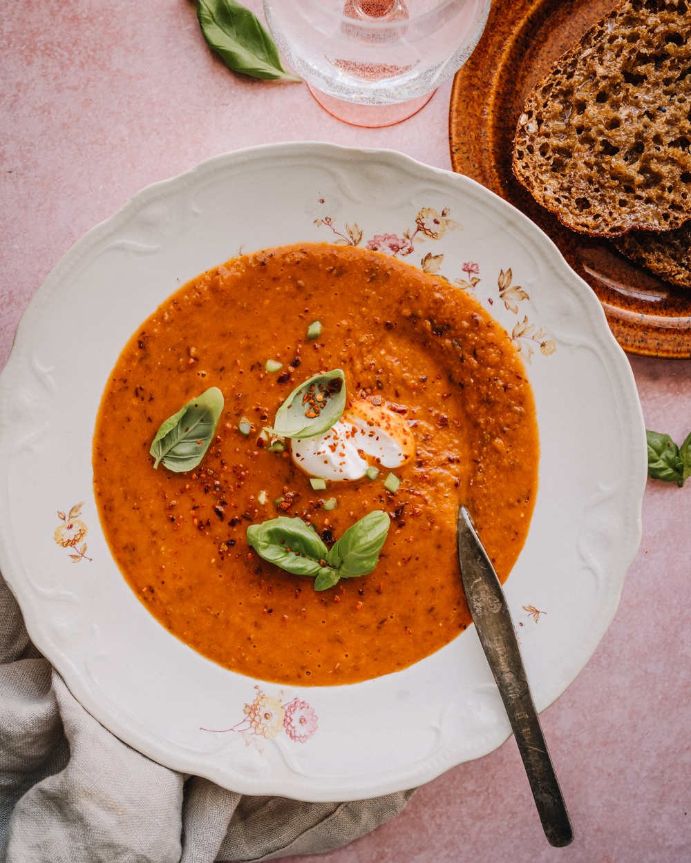 - Soseuta keitto kokonaan tai osittain. Mausta oman maun mukaan suolalla ja mustapippurilla. Viimeistele tuoreella basilikalla.
