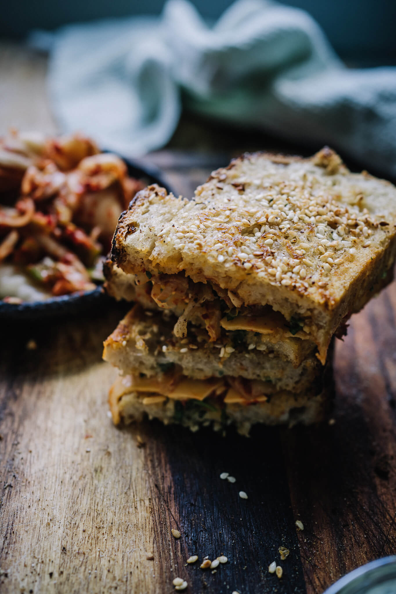 Kimchitoastit saavat upean ulkonäön, kun heität paistinpannulle seesaminsiemeniä. Ne tarttuvat leivän pintaan paistettaessa ja antavat ulkonäön lisäksi ihanaa makua.