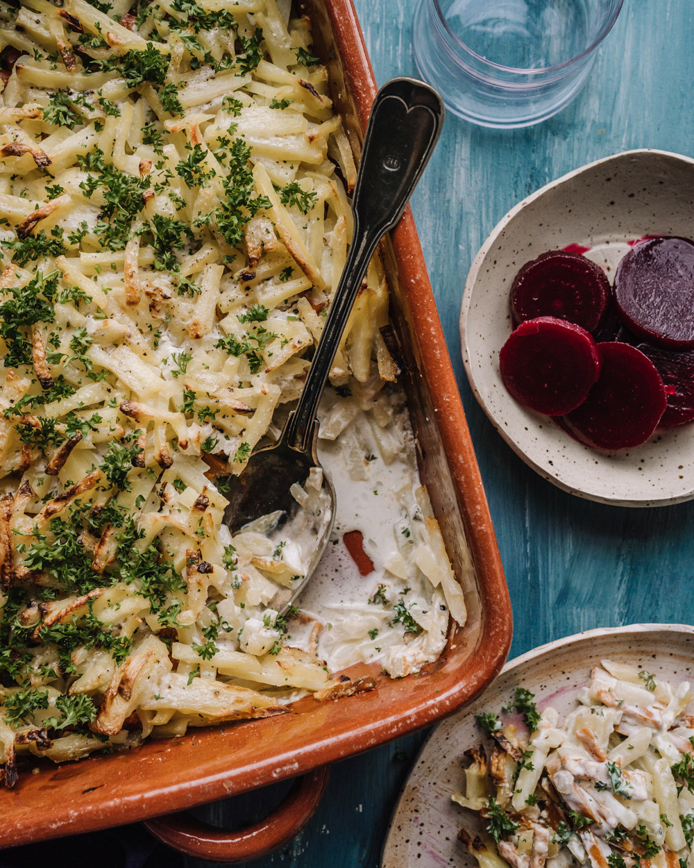 - Levitä “kinkku”suikaleet perunoiden päälle ja ripottele niiden päälle hienonnettu persilja (säästä halutessasi osa kypsän kiusauksen pinnalle ripoteltavaksi).