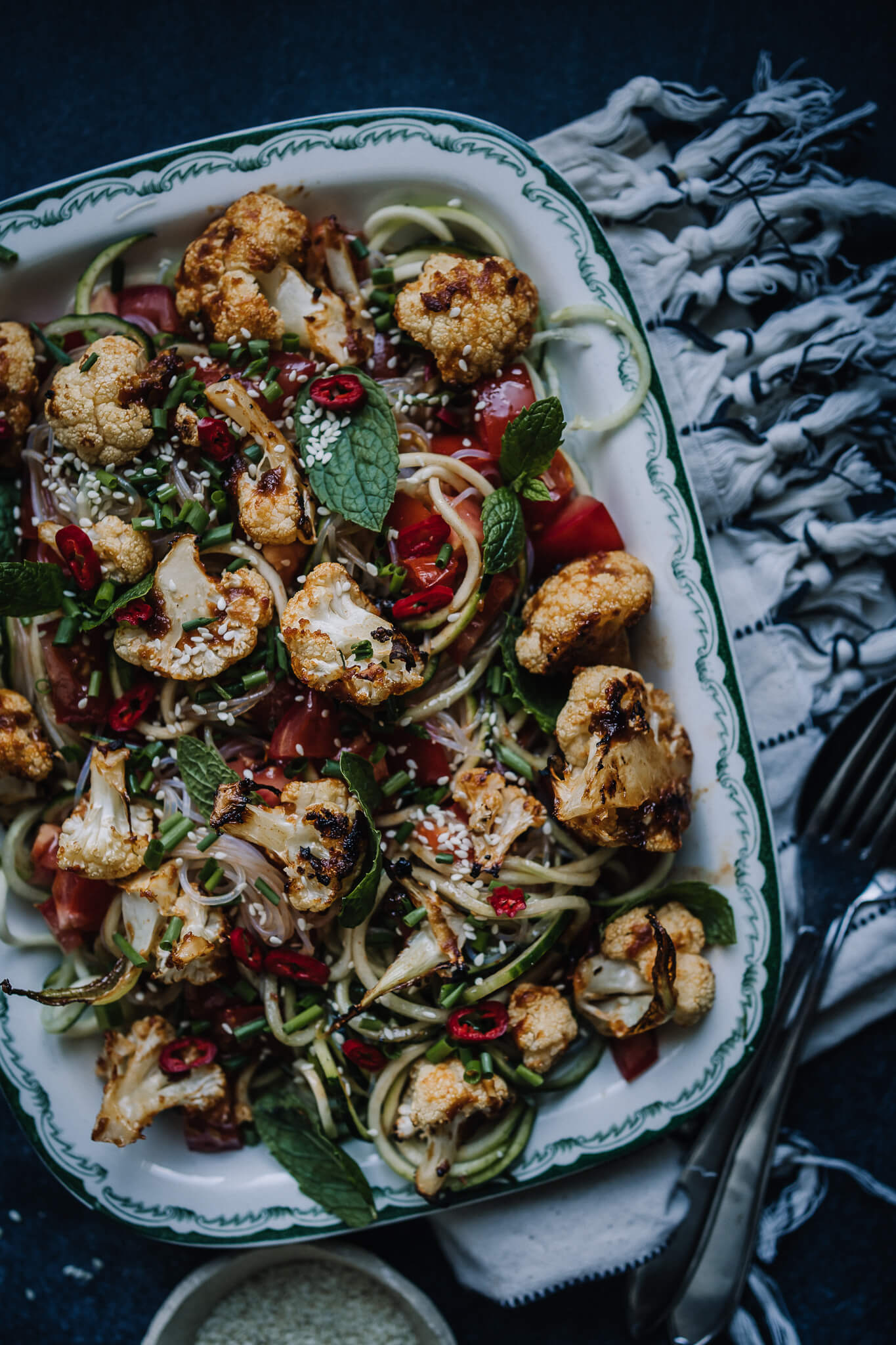 - Sekoita kaikki nuudelit keskenään ja levitä tarjoiluvadille. Leikkaa tomaatit kuutioiksi. Asettele nuudeleiden päälle tomaatit sekä gochujang-kukkakaalit ja valuta salaatinkastike ympäriinsä salaatin päälle. Viimeistele runsaalla määrällä silputtuja yrttejä, tuoreella chilillä sekä seesaminsiemenillä.