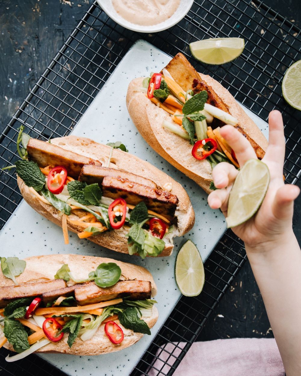 - Halkaise patongit ja voitele reilusti Ssamjang-majoneesilla. Täytä patongit vesikrassilla, pikapikkelöidyillä vihanneksilla, paistetulla tofulla, chilillä ja mintulla. Purista päälle limen mehua ja tarjoile.