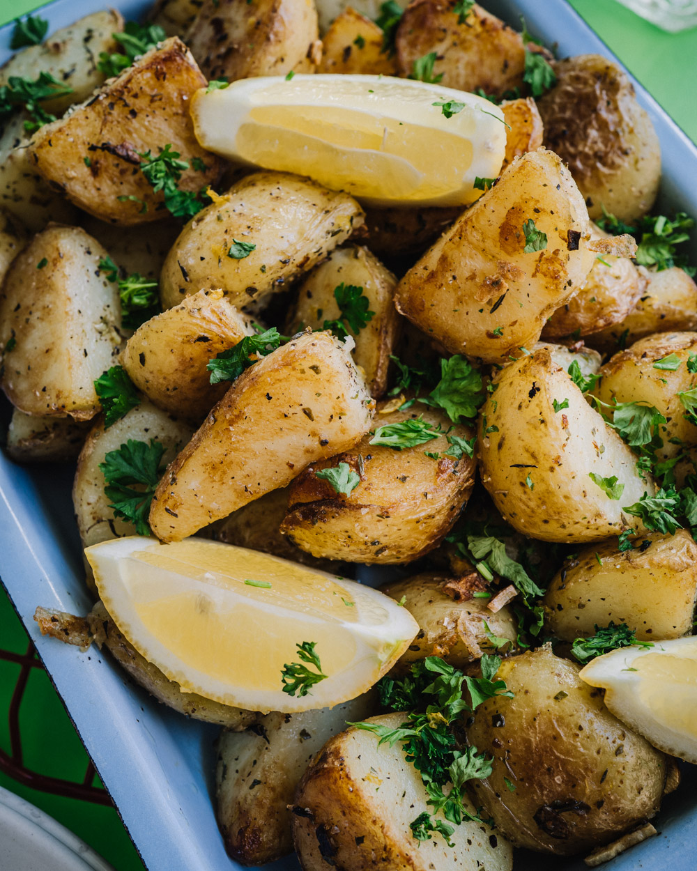 Kreikkalaiset paistetut perunat ovat täydellinen lisuke vaikkapa pääsiäispöytään! Rapea pinta, pehmeä sisus ja raikas sitruunaisuus saavat kaverikseen oreganoa ja valkosipulia.