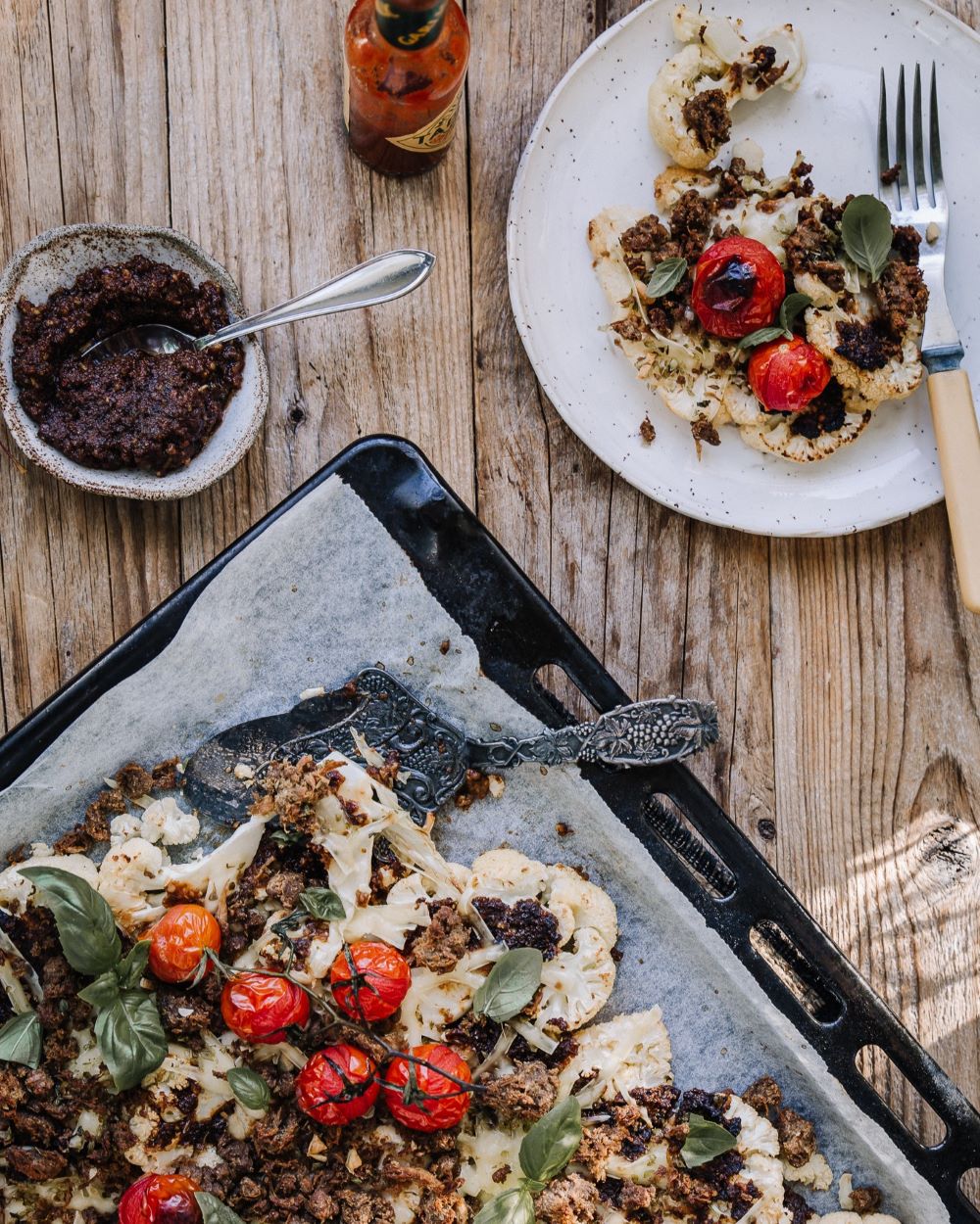 - Valmista pesto alla olevan ohjeen mukaan ja levitä siitä noin puolet kukkakaalien päälle. Levitä peston päälle juustoraaste, nyhtökaura ja tomaatit. Mausta oreganolla.