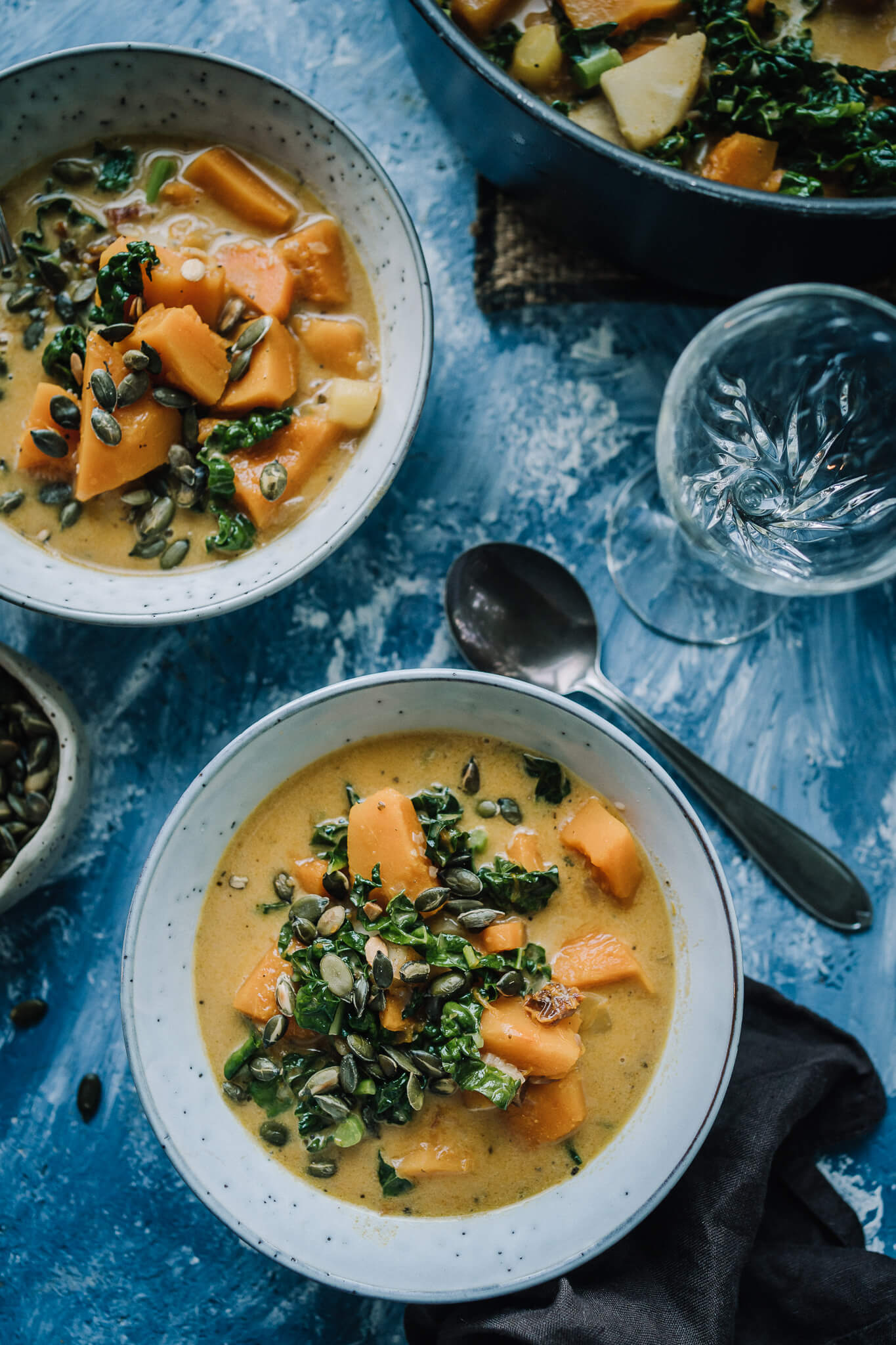 Kurpitsa-mustakaalikeitto on vihanneksia pullollaan oleva sakea soppa, chowder-tyylinen. Vegaaninen keitto on helppo ja nopea valmistaa ja se maistuu myös uudelleen lämmitettynä.
