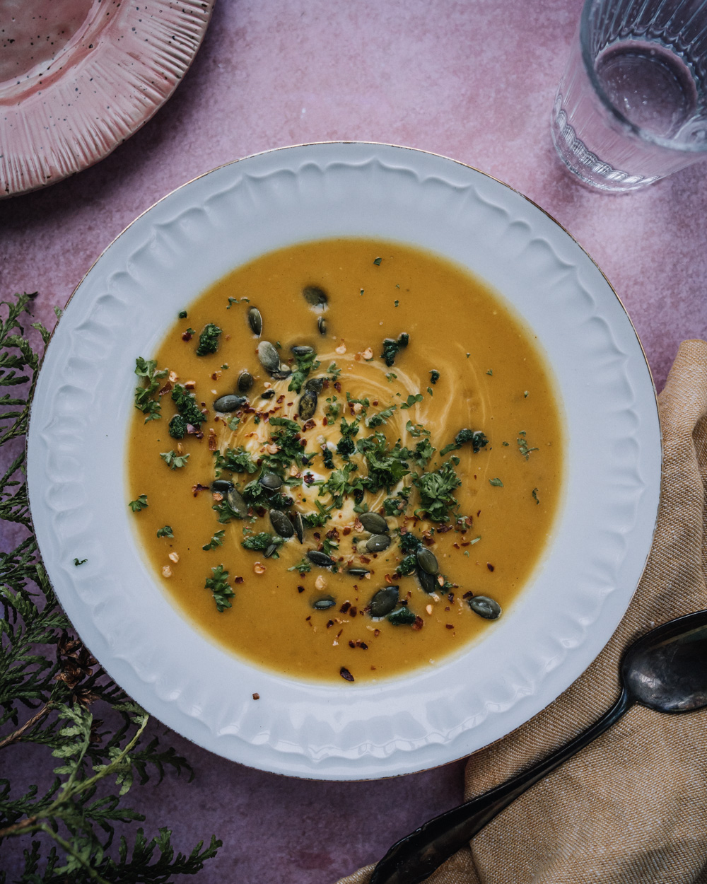 Tässä keitossa maistuvat kaksi talvista suosikkia: myskikurpitsa ja persimon. Persimon antaa ruualle pehmoista makeutta. Keiton päälle sopii hyvin myös ripotella chilihiutaleita, pieni tulisuuden vivahde toimii hienosti.
