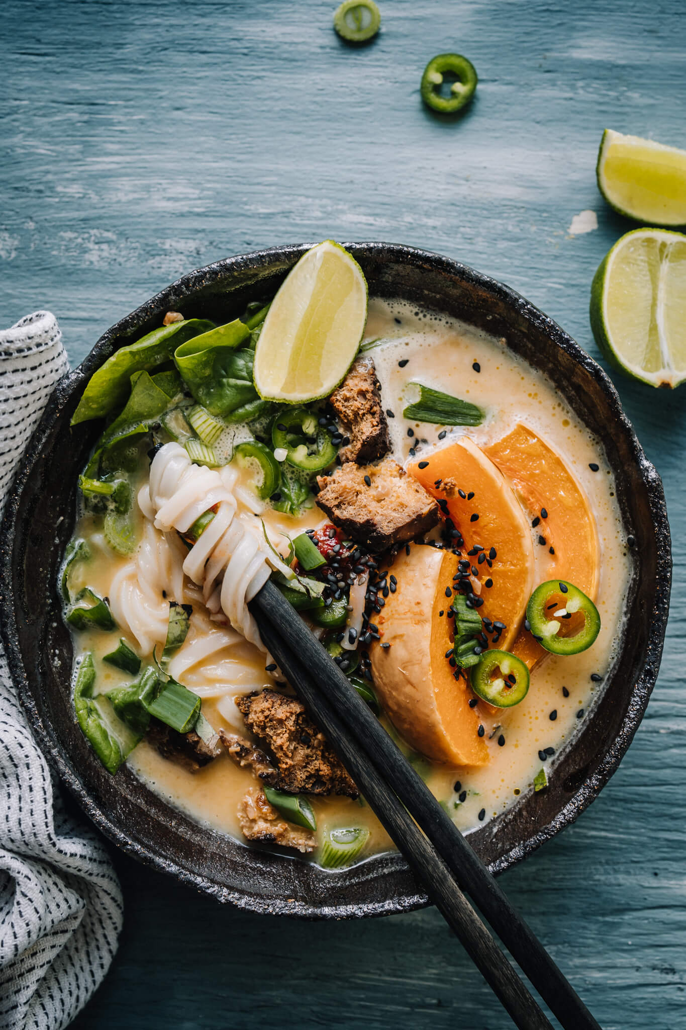 Kurpitsaramen tofulla on ihana syksyinen nuudelikeitto. Helppotekoinen soppa valmistuu alle puolessa tunnissa ja on hyvin muunneltavissa.