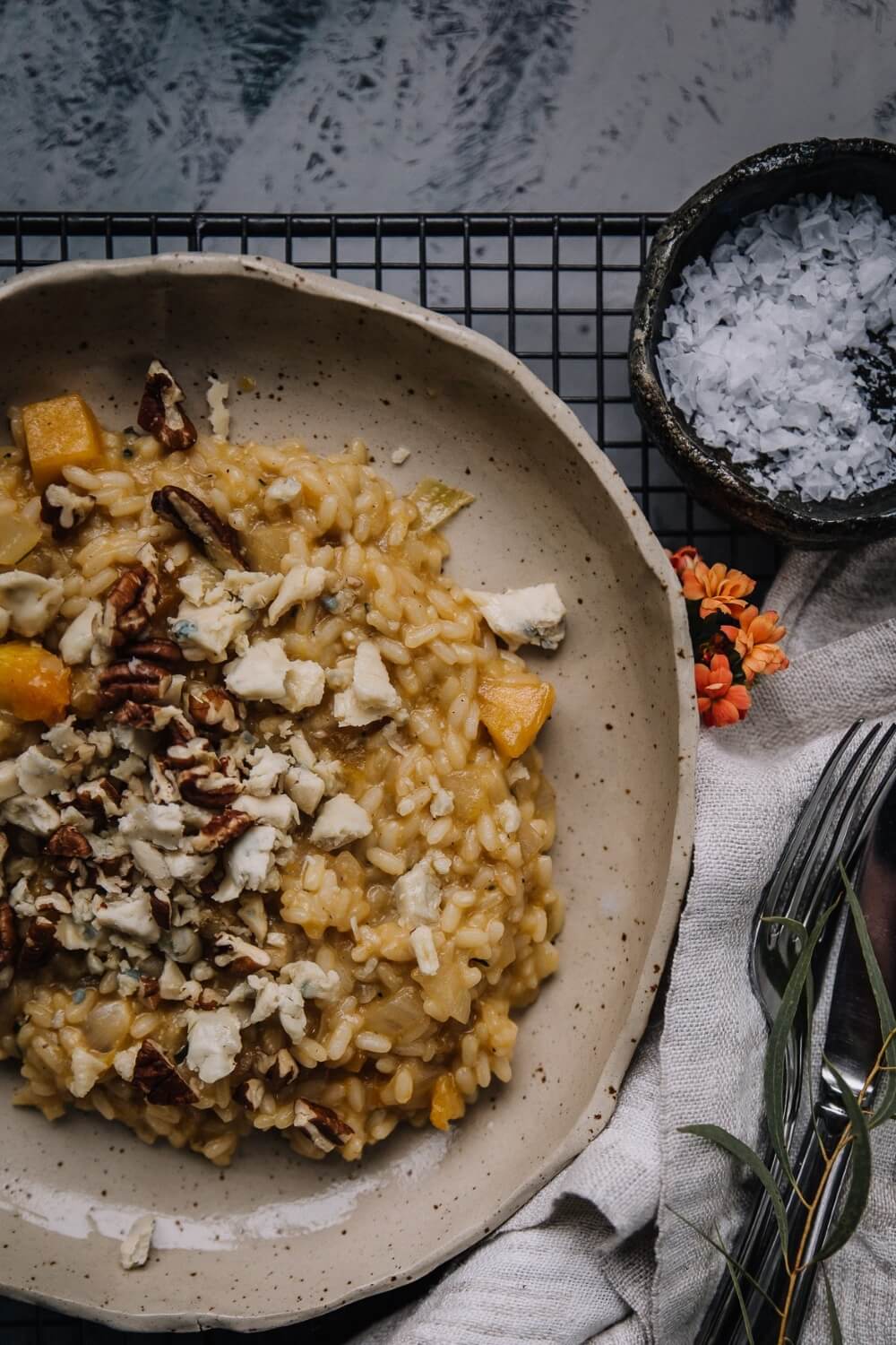 Kurpitsarisotto on syksyinen herkku! Tällä kertaa se saa makua misotahnasta ja tarjoillaan pekaanipähkinöiden ja vegesinihomejuuston kanssa.