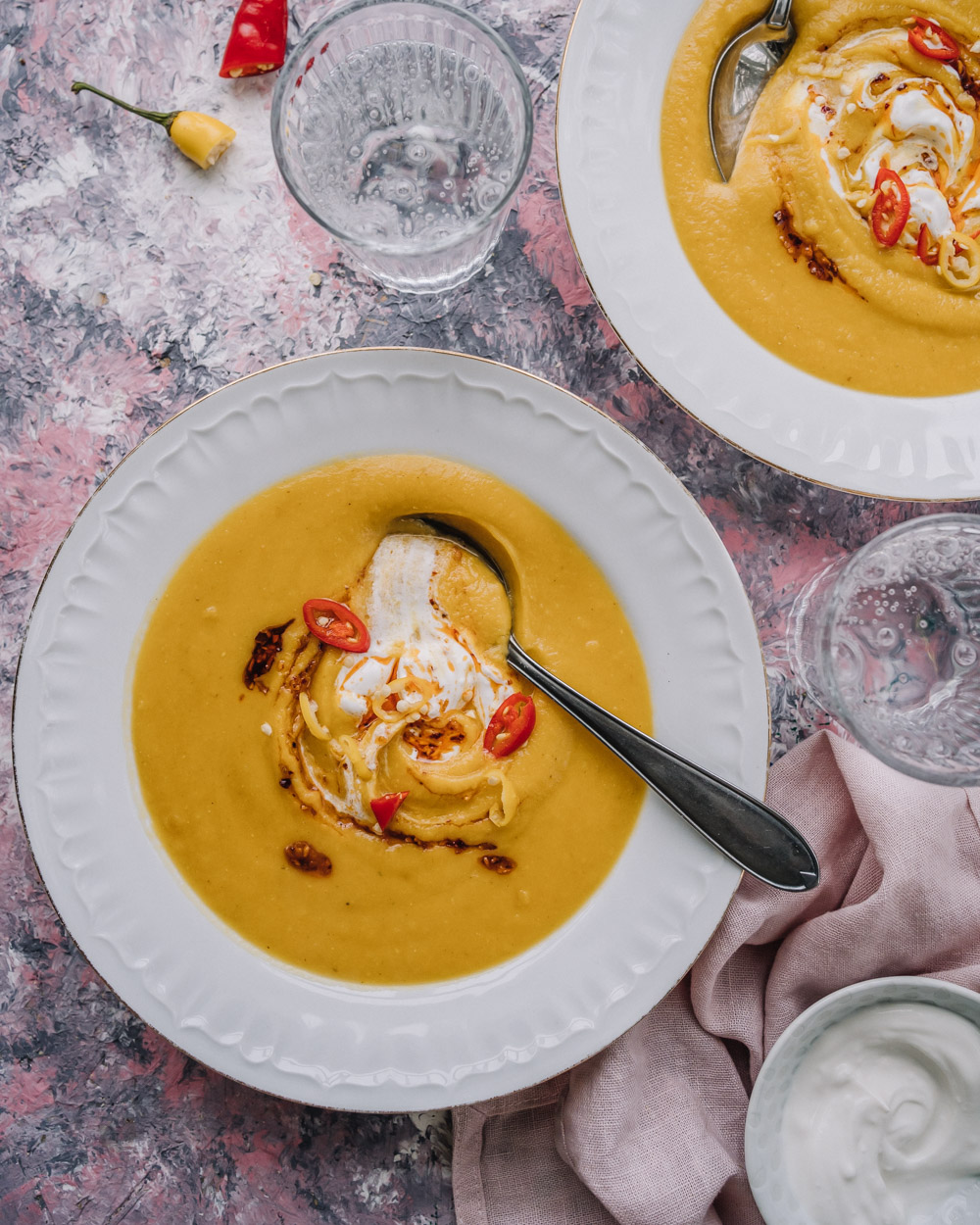 - tarjoiluun vegaanista fraichea tai jogurttia sekä chiliä tuoreena ja/tai kastikkeena (kuvassa valkosipuli-chiliöljyä)