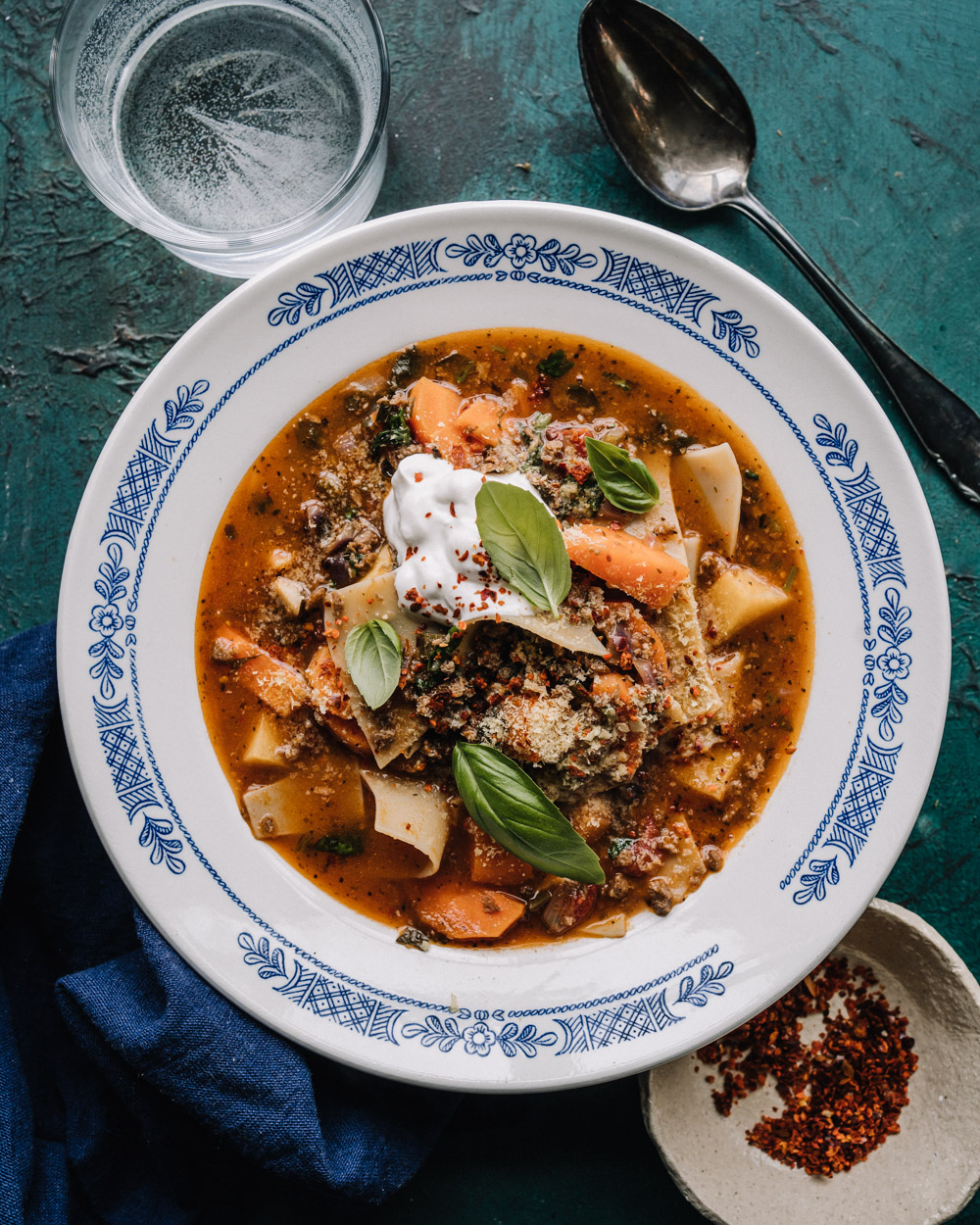 Lasagnekeitto lainaa raaka-aineensa lasagnesta: pastalevyjä, kasviksia sisältävä tomaattinen liemi, soijarouhetta ja tarjoiluun valkokastikkeen sijasta vegaanista fraichea. Helppoa ja herkullista.