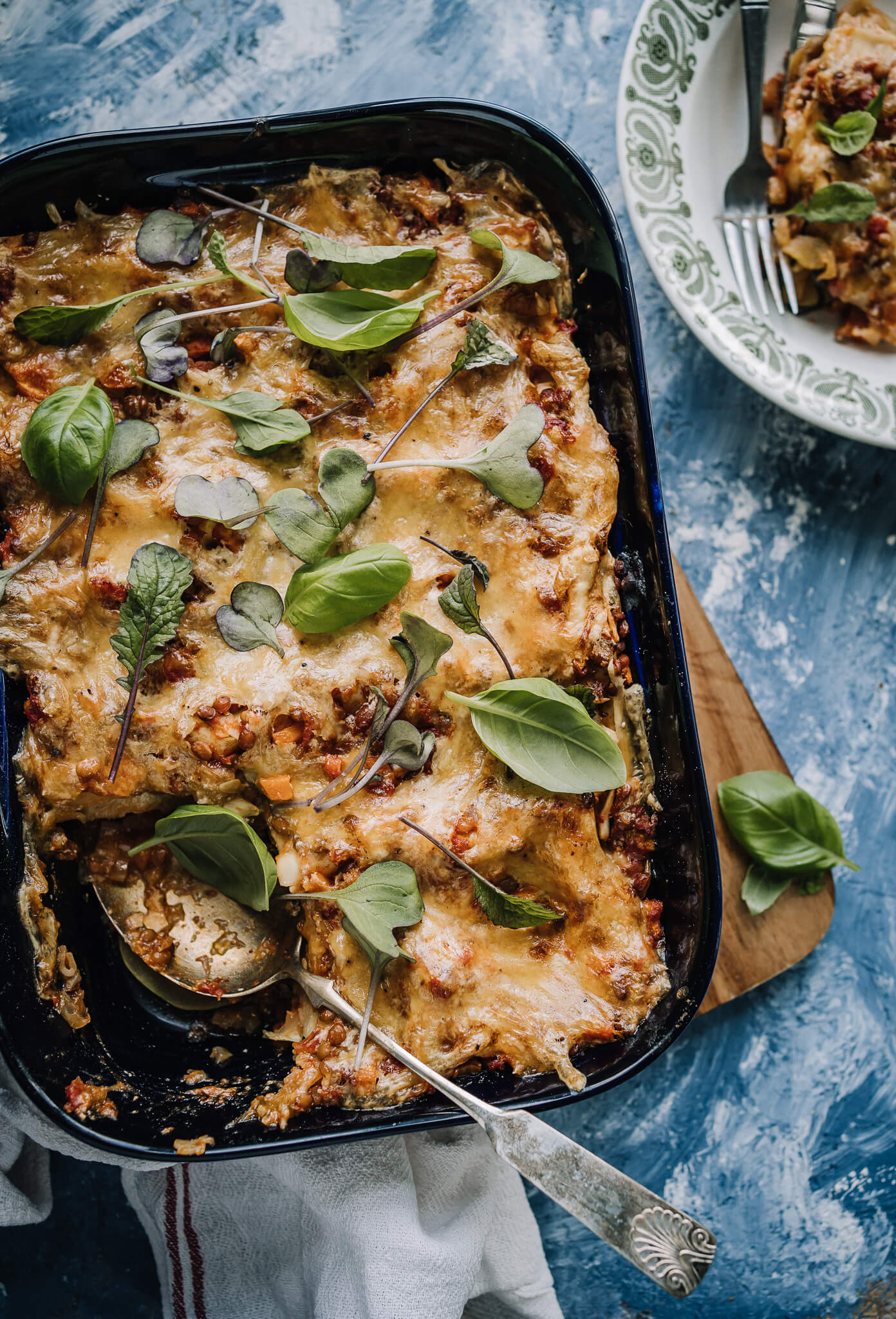 - Paista lasagnea uunissa noin 40-45 minuuttia. Anna vetäytyä 15 minuuttia ennen tarjoilua. Halutessasi koristele lasagne versoilla ja/tai basilikan lehdillä.