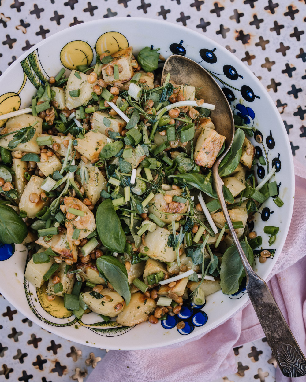 Linssi-perunasalaatti on ruokaisa tarjottava piknikille, juhlapöytään ja grilliaterialle. Versot, kevätsipuli ja ihanan aromaattinen basilikavinegretti viimeistelevät makumaailman.