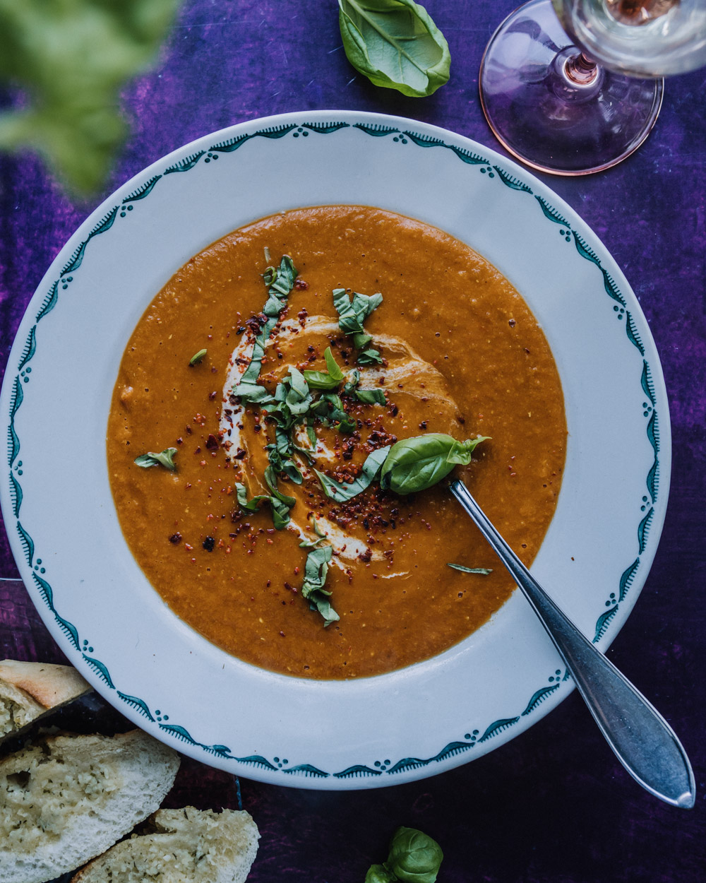 - Sekoita kaurakerma joukkoon ja anna kuumentua. Soseuta keitto (tai jätä soseuttamatta, makuasioita). Purista sitruunan mehu keiton sekaan juuri ennen tarjoilua. Viimeistele hienonnetulla basilikalla.