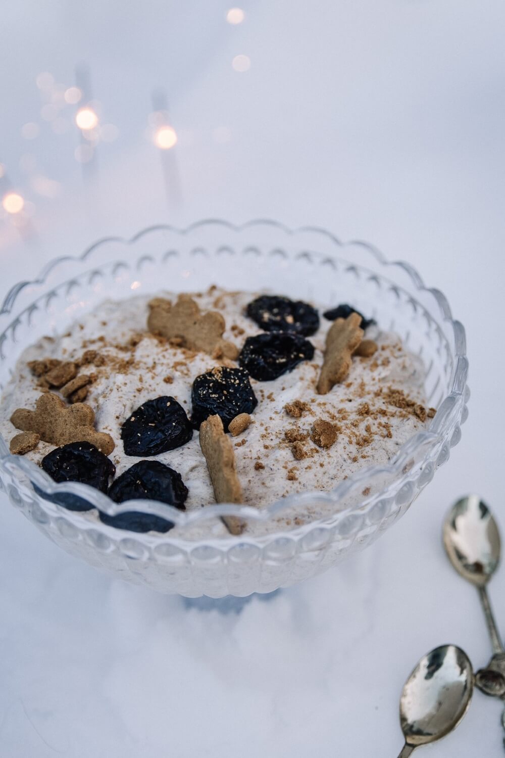 Luumurahka on raikas ja kepeä jälkiruoka jouluun. Se onnistuu erinomaisesti ilman eläinperäisiä aineksia. Juhlan kunniaksi luumurahka koristellaan piparkakuilla.