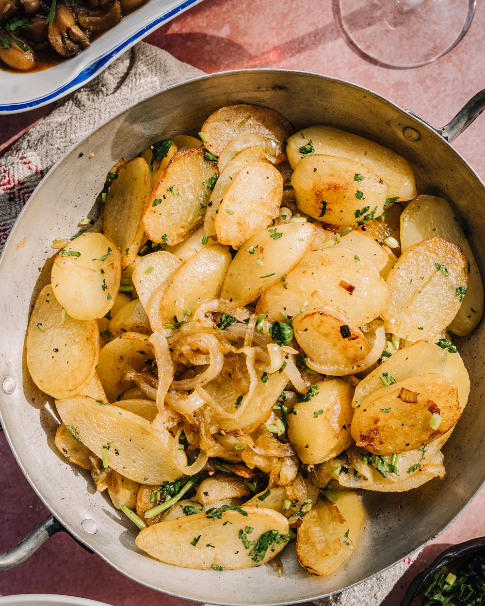 - Sulata puolet jäljellä olevasta voista pannulla ja ruskista puolet perunoista. Siirrä sivuun odottamaan, lisää loput voista ja paista loput perunat ihanan ruskistuneiksi. Lisää lopuksi pannulle kaikki perunat ja sipulit ja paista vielä hetki. Mausta mustapippurilla ja hienonnetulla lehtipersiljalla.