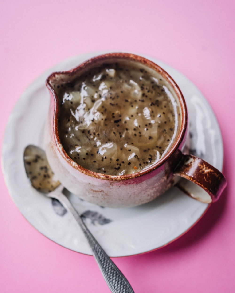 - Sekoita sipulin joukkoon sokeri, unikonsiemenet, suola ja pippuri. Lisää 1 dl vettä ja kuumenna kiehuvaksi. Anna poreilla muutama minuutti.