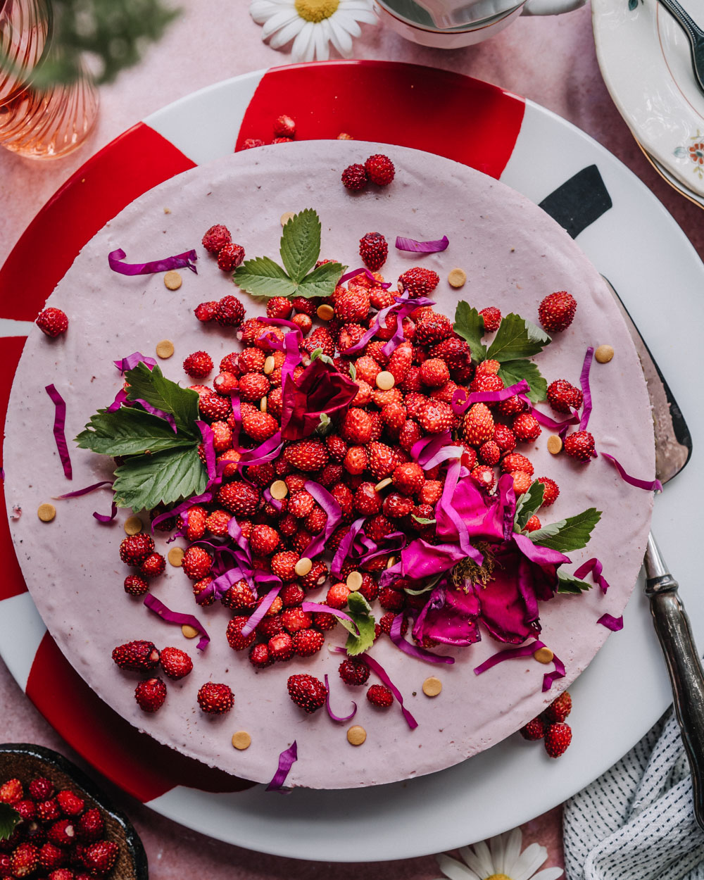 Mansikkajuustokakku maistuu kesälle! Mansikkasesongin ulkopuolella kakku on helppo valmistaa pakastemarjoista. Kasvipohjainen juustokakku hyydytetään vegegelillä, jonka käyttö on yhtä helppoa kuin liivatteenkin.