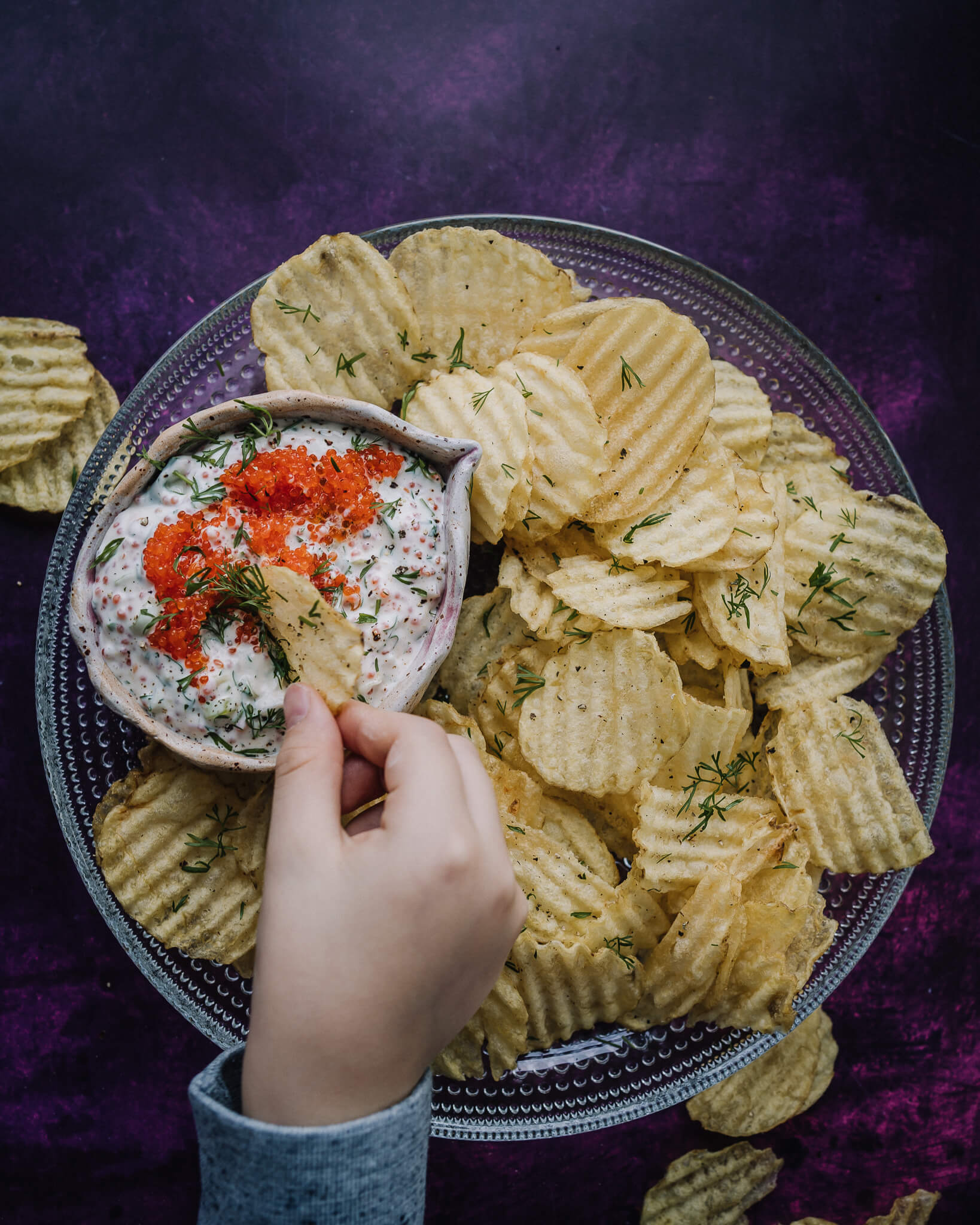 Merilevästä tehty mäti toimii tässä dipissä aivan erinomaisesti, se on maultaan ja koostumukseltaan hyvin samankaltaista, kuin kalan mäti. Merilevämädin lisäksi dippiin tulee salottisipulia, kevätsipulia, tilliä, sitruunaa, vegaanista majoneesia ja fraichea (Valio Oddlygoodin Dream Fraiche toimii tässä loistavasti) sekä mustaa ja valkoista pippuria.