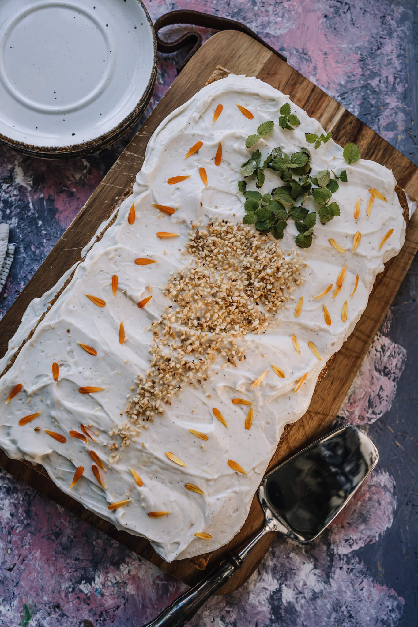 Mausteinen porkkanakakku on juhlien hurmaavin leivonnainen. Mehevä kakku on helppotekoinen ja vegaaninen.