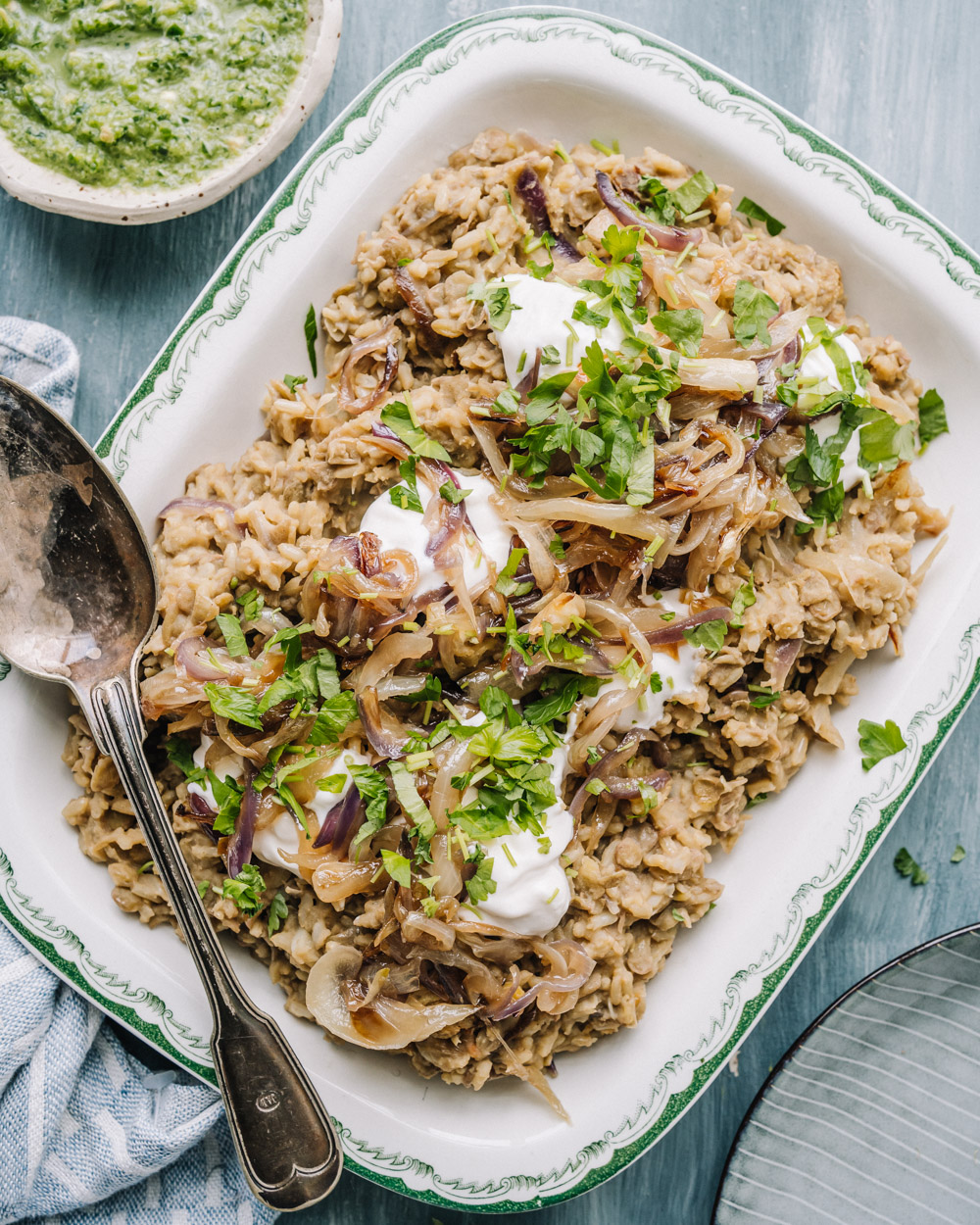 Makuelämys on täydellinen, kun mujadaran tarjoilee raikkaan jalapeno-shattan ja kasvipohjaisen turkkilaisen jogurtin kanssa.