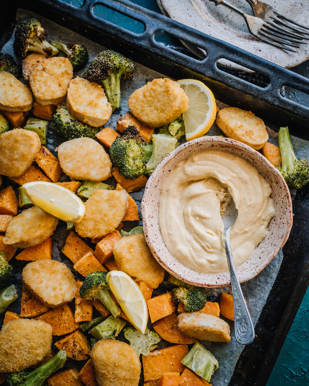 Nugettipelti on helppo yhden pellin ruoka, joka tarjoillaan raikkaan kylmän currykastikkeen kanssa. Reseptissä mainittujen bataattien ja parsakaalien sijaan voi hyvin käyttää muitakin sesongissa olevia lempparivihanneksia!