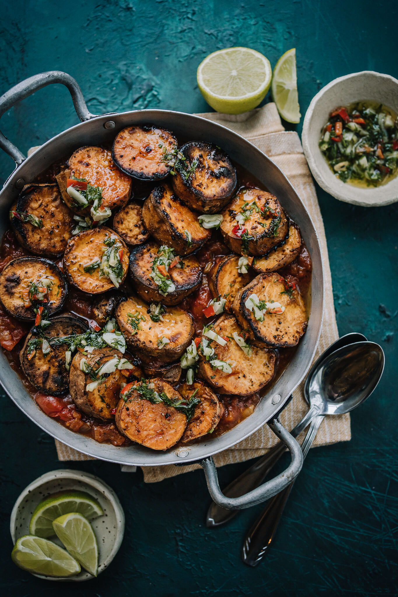 Bataatit paahdetaan kuumassa uunissa ja sitten upotetaan upean makuiseen kardemummalla ja limen kuorella maustettuun tomaattikastikkeeseen. Viimeisen silauksen ruualle antaa valkosipuli-chili-tilli-limeseos, joka ripsautellaan valmiin ruuan päälle. Voit tarjoilla seoksen myös erikseen, jos tarjoilet ruokaa lapsille tai muille chilistä piittaamattomille.
