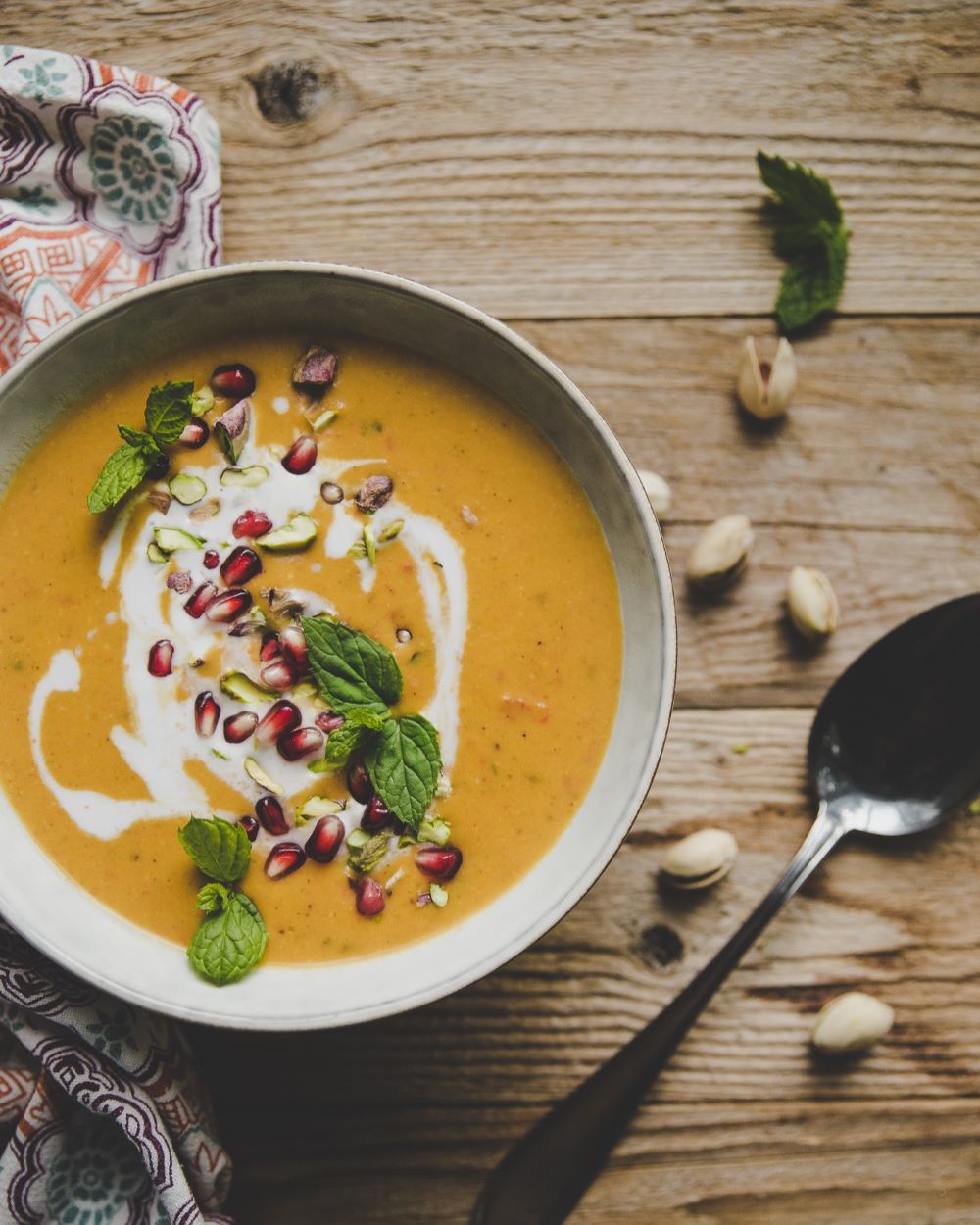 - Jaa keitto lautasille ja viimeistele annokset kookoskermalla, granaattiomenansiemenillä, rouhituilla pistaasipähkinöillä ja tuoreella mintulla.