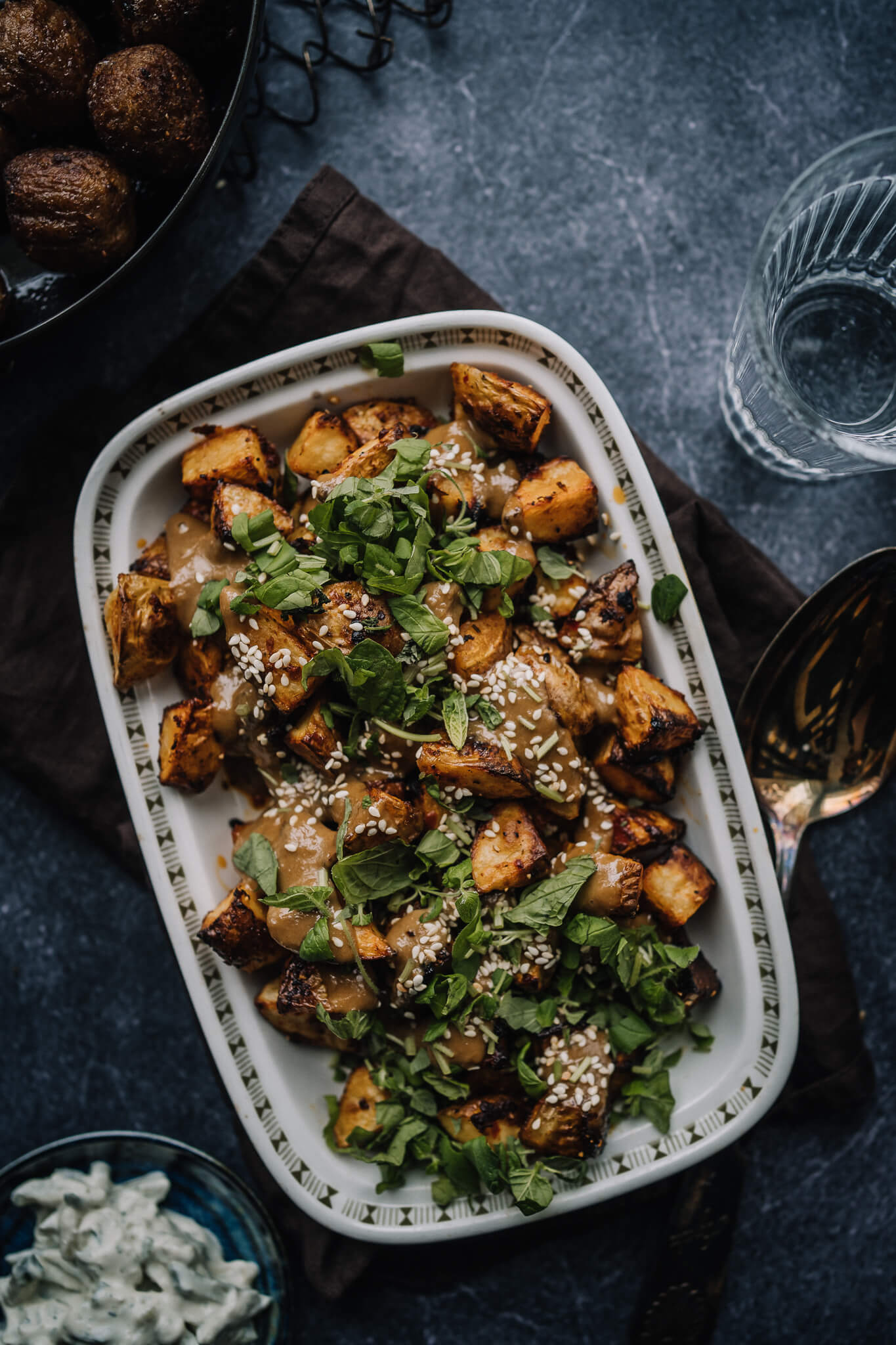 - Siirrä perunat tarjoiluvadille ja lusikoi kastike päälle. Viimeistele seesaminsiemenillä ja hienonnetulla tuoreella mintulla.