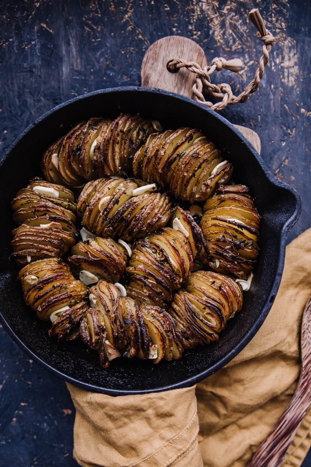 Joulupöytään mahtuu aina yksi uusi perunaruoka. Tämä näyttävä valkosipulinen perunaherkku on kuin omiaan jouluruokien kaveriksi. Paahdetut valkosipuliperunat leikataan ohuiksi viipaleiksi, jotka ladotaan vuokaan pystyasentoon, jolloin perunoiden pinta paahtuu ihanan rapeaksi. Perunasiivujen väliin työnnetään runsaasti valkosipulia – ne on syytä laittaa vasta paistamisen puolivälissä, jotta ne eivät pääse vahingossakaan palamaan.