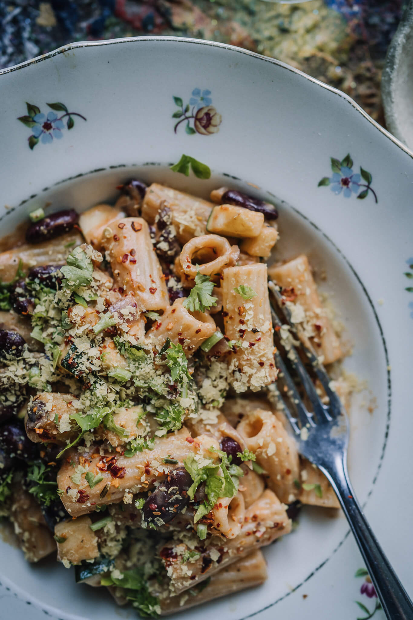 - Lisää papuseoksen joukkoon pastakastike ja anna kastikkeen porista hissukseen, kunnes pasta on valmista. Sekoita lopuksi kaurakerma kastikkeen joukkoon ja anna pulpahtaa. Mausta kastike mustapippurilla (maista myös, kaipaako se suolaa) ja runsaalla määrällä hienonnettua tuoretta yrttiä.