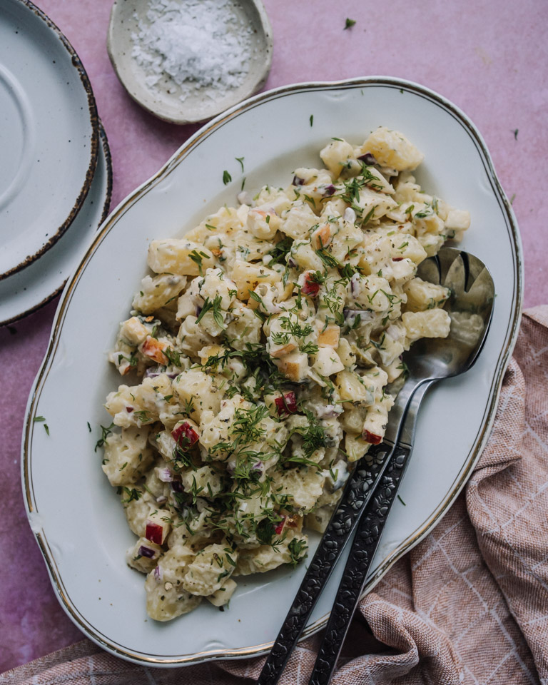 Perunasalaattia tarjoillaan niin uudenvuoden juhlissa kuin vappuna ja juhannuksenakin. Salaatti on helppotekoinen ja onnistuu loistavasti myös täysin kasvipohjaisena. Punasipuli, omena, suolakurkku ja tilli antavat ruualle luonnetta ja viherpippurit pienen twistin makumaailmaan. Halutessasi voit maustaa salaatin vihreiden pippureiden sijaan mustapippurilla.