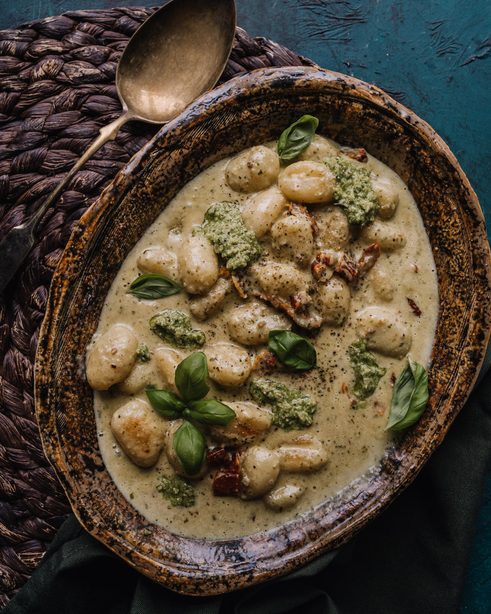 Pestognocchit maistuvat monien ruokien lisukkeena. Itse tehty vegaaninen basilikapesto kohtaa aromaattiset aurinkokuivatut tomaatit kaurakermakastikkeessa, lopputulos on huikean herkullinen.