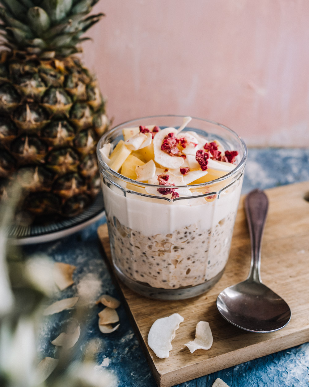 Pina colada tuorepuuro on ihanan trooppinen aamiaisherkku, joka valmistuu tuossa tuokiossa (kunhan sen muistaa laittaa jo illalla jääkaappiin tekeytymään). Ananaksen ja kookoksen kombo on vastustamaton!
