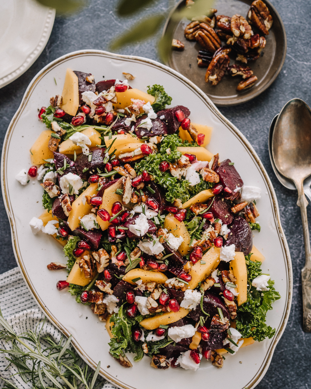 Tässä salaatissa on monia erilaisia makuja, jotka loistavat yhdessä. On makeaa persimonia, raikasta granaattiomenaa, maanläheistä punajuurta ja mielenkiintoisesti juustokuminalla maustettua lehtikaalia. Loppusilauksen antavat siirapilla makeutetut paahdetut pähkinät ja vegaaninen feta. Juhlava salaatti on omiaan jouluaterian iloisena piristäjänä.